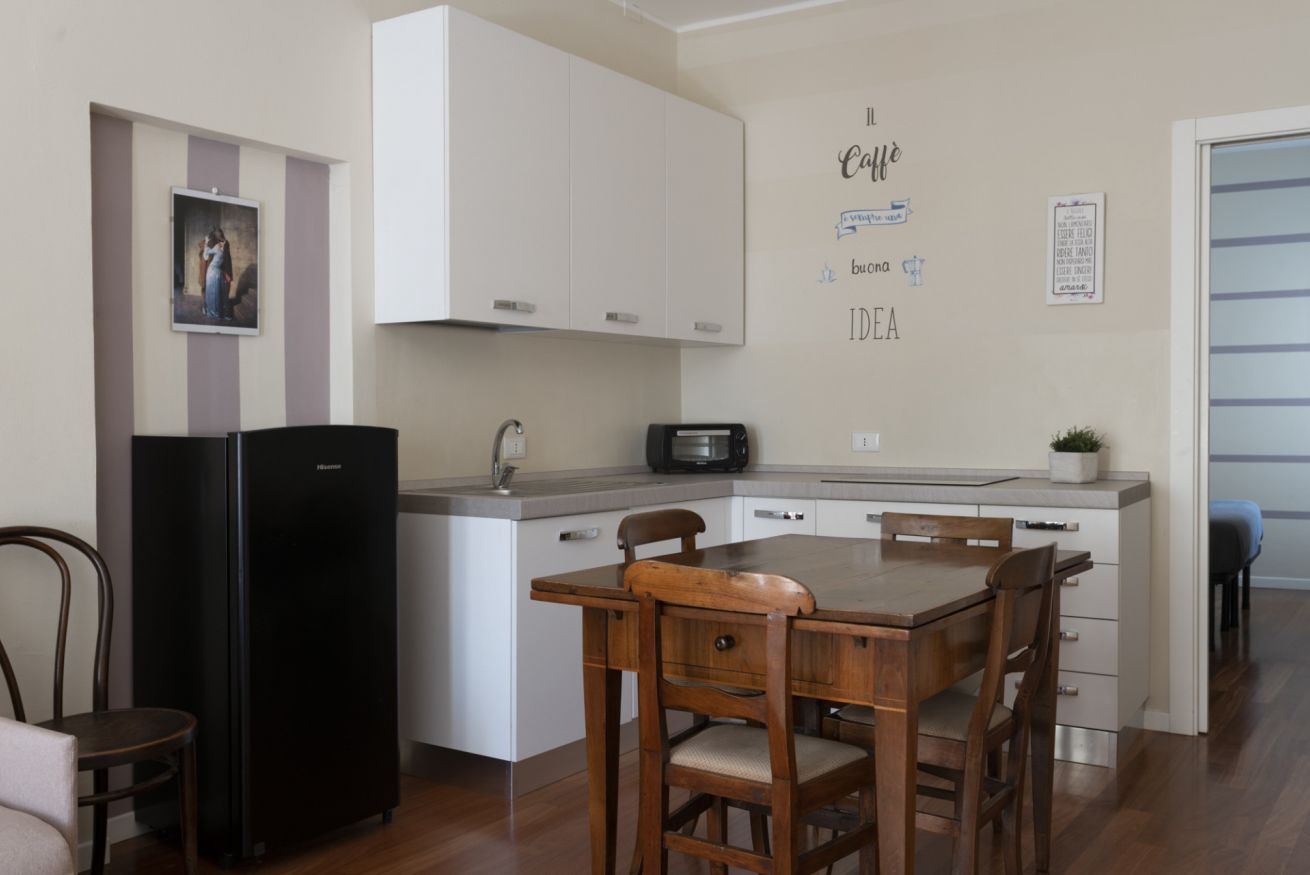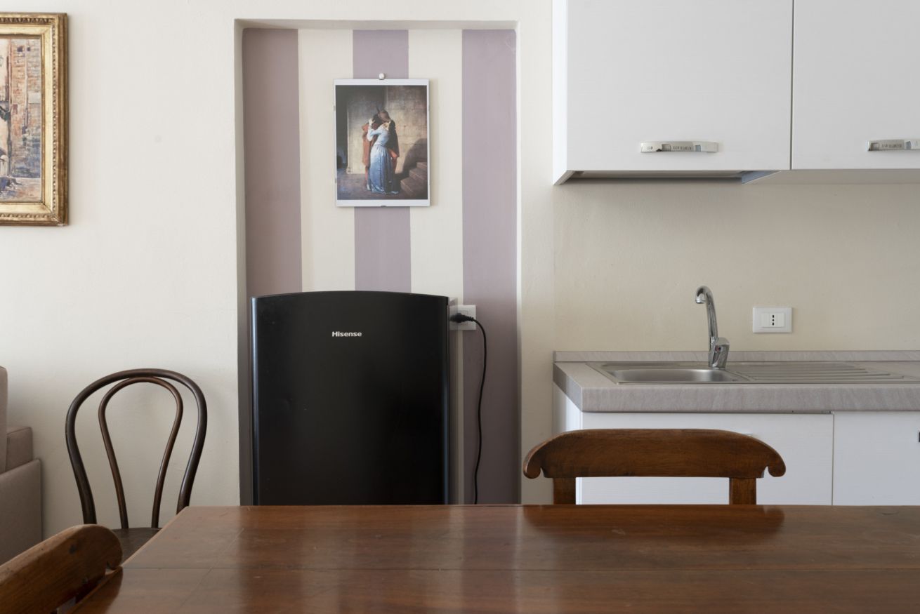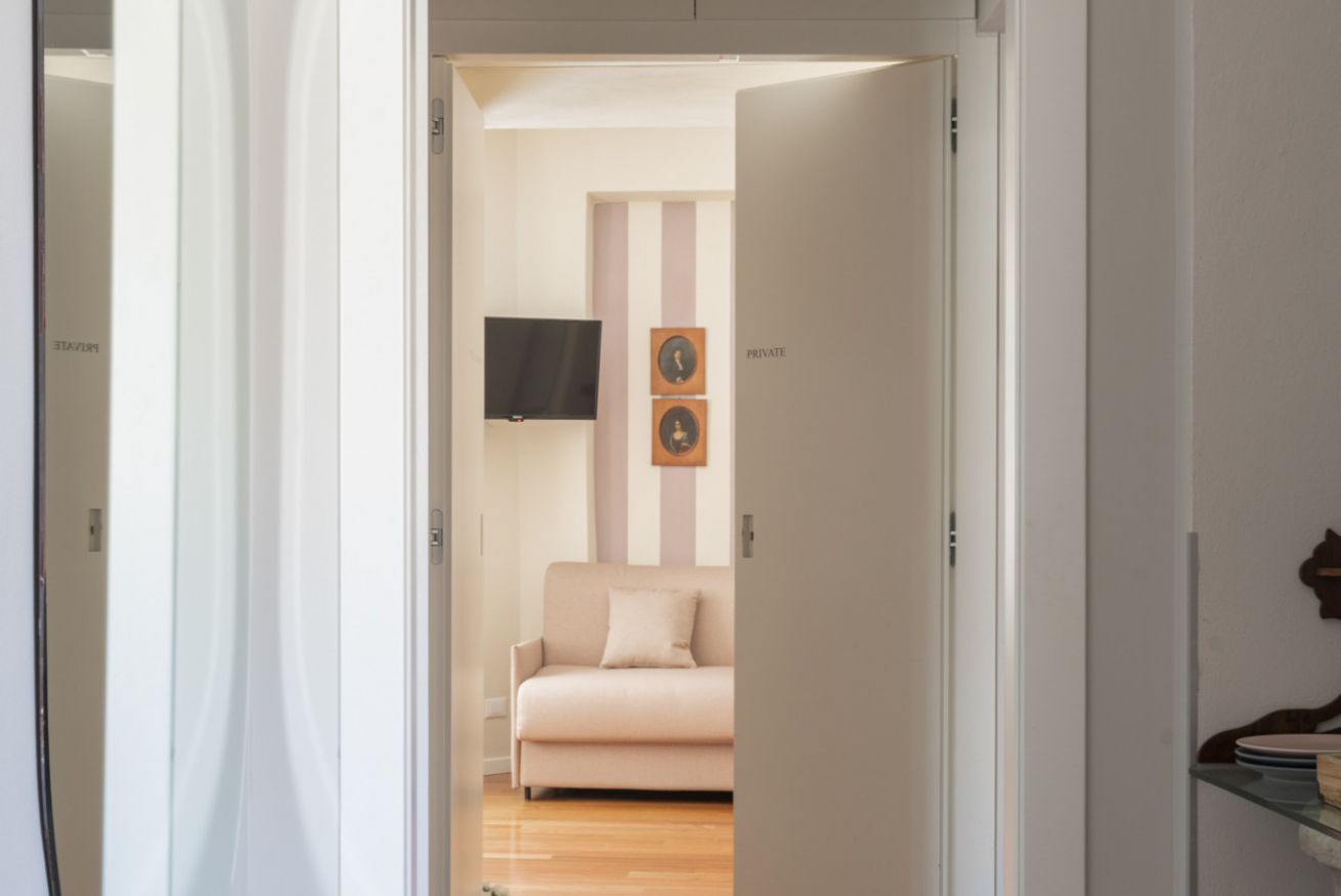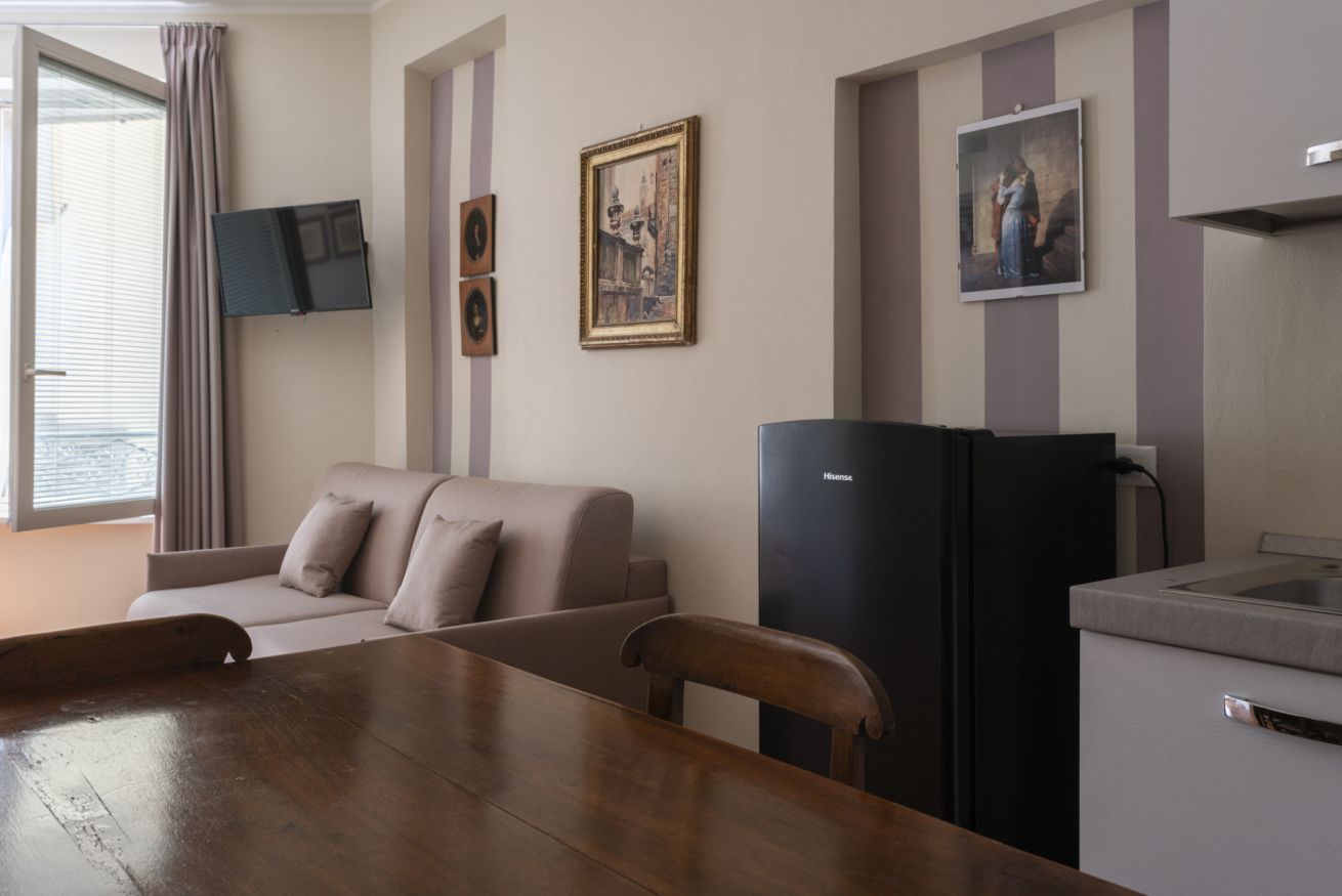 L'appartamento è composto da un soggiorno con angolo cottura e divano letto, una camera da letto con letto matrimoniale, e un bagno ad uso privato situato esternamente all'appartamento, accessibile dall'ingresso comune.